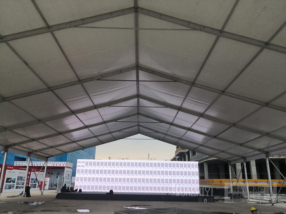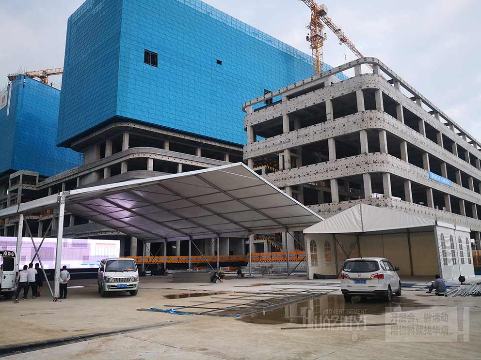 華熠公司篷房材質要求也是精益求精,支架的高強度氧化鋁合金材質和篷布的高阻燃雙層pvc材質。篷房款式也從最開始的單一折疊篷房,到后來的全鋁合金框架篷房,弧形篷房,球形篷房,多邊形篷房等。我公司也在不斷的完善篷房的配套系統,如冰箱,紗幔,pvc窗體,桌椅,舞臺架等。