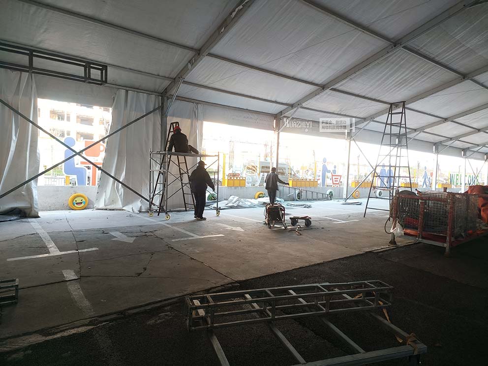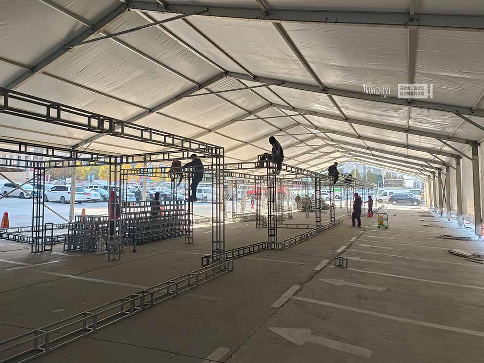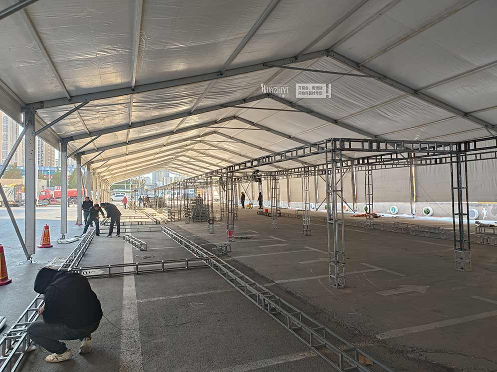 鄭州活動篷房出租篷內還可以搭建桁架展位。鄭州華熠公司正在一處活動場地上搭建篷房,現在的篷房外部框架已經落成,工人們正在搭建桁架展位,桁架展位可以進一步將篷房內的空間進行劃分,使得空間多動能性增加不少。