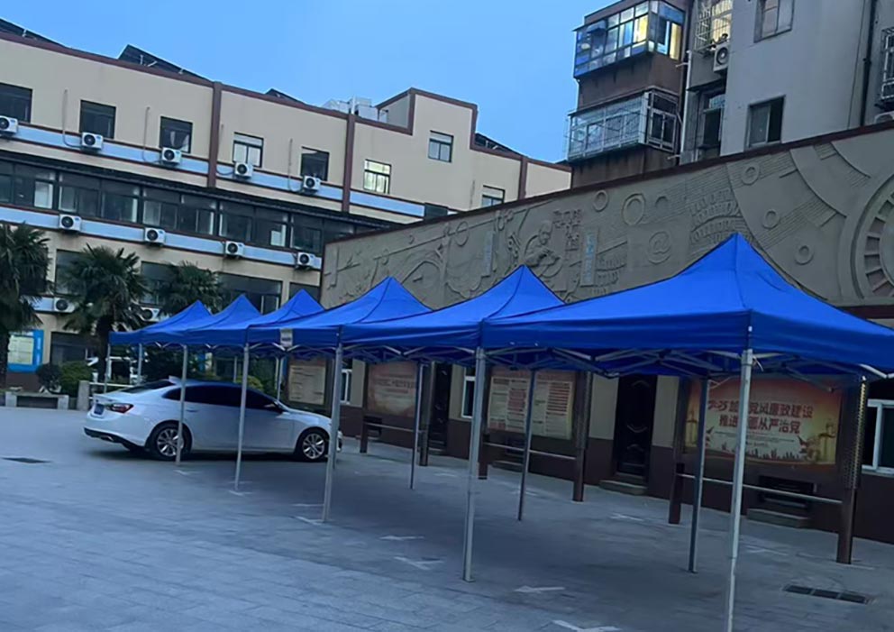 鄭州科技工業學校的校園里,幾頂藍色折疊帳篷在陽光下泛著沉穩的光澤。這是鄭州篷房出租公司為校園活動布下的臨時空間,靛藍色的篷布與周圍的綠樹、紅磚教學樓形成鮮明對比,卻又以恰到好處的尺度融入校園環境,為師生們提供著一片可遮陽避雨的實用角落。